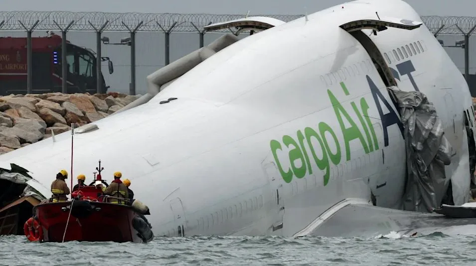 Një avion mallrash Boeing 747 rrëshqiti nga pista dhe u rrëzua në det në Aeroportin Ndërkombëtar të Hong Kongut të hënën në mëngjes, duke vrarë dy punonjës të sigurisë së aeroportit, automjeti i patrullës së të cilëve u godit nga avioni jashtë kontrollit. Katër anëtarët e ekuipazhit në bord të avionit mbijetuan.