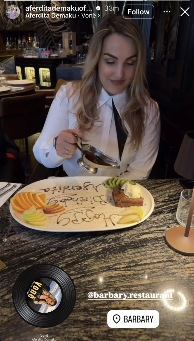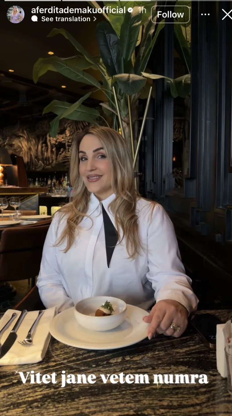 Afërdita Demaku sot ka ditëlindjen,ja ku po e feston 04/01/202604/01/2026 Facebook Twitter Viber WhatsApp Email Këngëtarja Afërdita Demaku feston sot ditëlindjen. Ajo po kalon mbrëmjen në Barbary Restaurant, në shoqërinë e familjes së saj. Artistja ka ndarë në Instagram momente nga festa, duke i bërë ndjekësit pjesë të ditës së saj speciale. Screenshot Screenshot