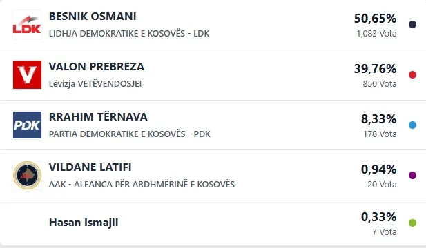 Besnik Osmani nga LDK-ja prin me 52.54 për qind, Valon Prebreza Vetëvendosje 35.63 për qind, Rrahim Tërnava PDK 10 për qind, Vildane Latifi AAK 1.34 për qind dhe kandidati i pavarur Hasan Ismajli 0.49 për qind.