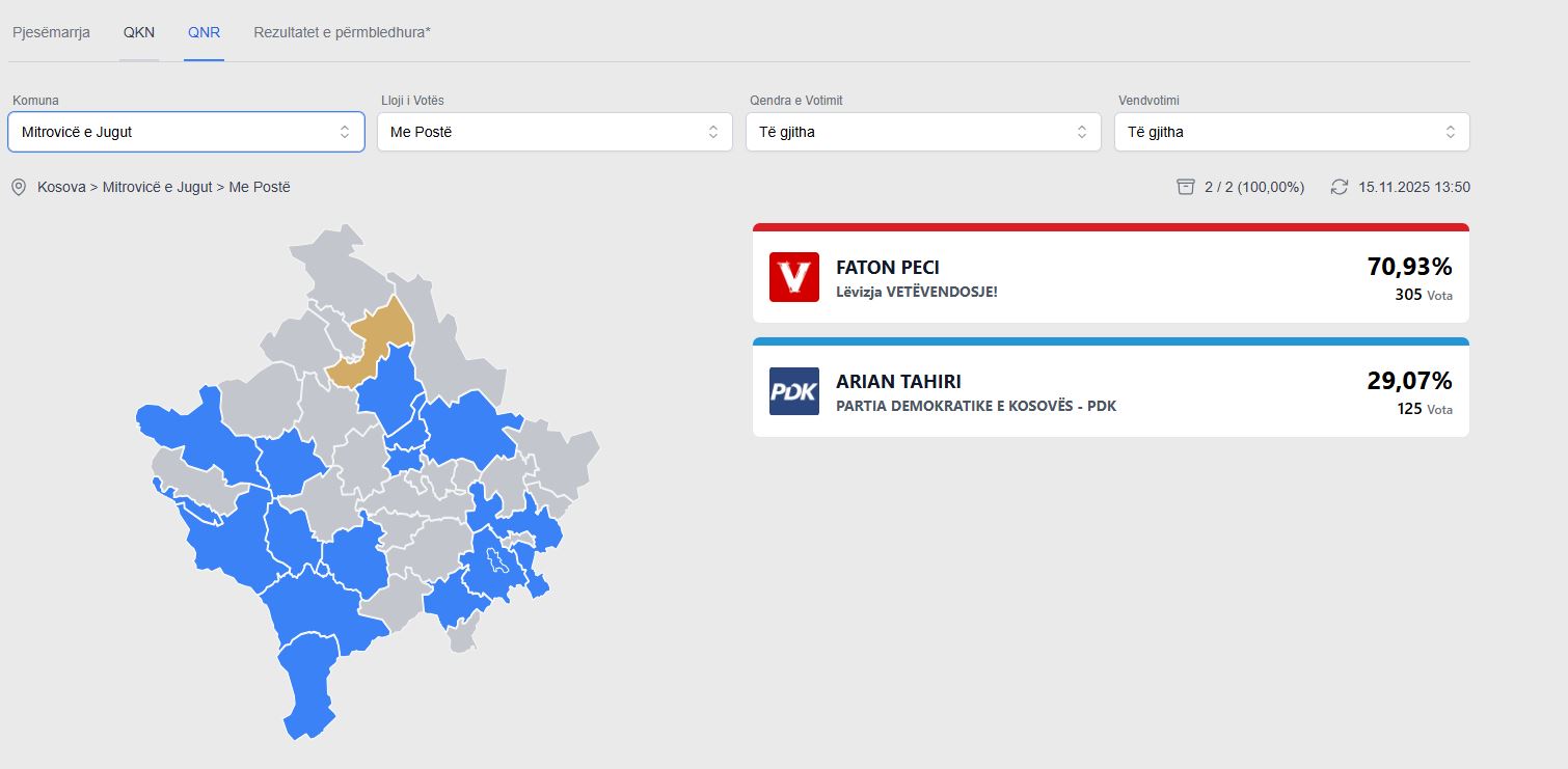 Bazuar në rezultatet e përmbledhura të KQZ-së, Faton Peci ka fituar kryesinë e Mitrovicës me 18.235 vota, duke mposhtur kështu Arian Tahirin e PDK-së, i cili siguroi gjithsej 15.743 vota.