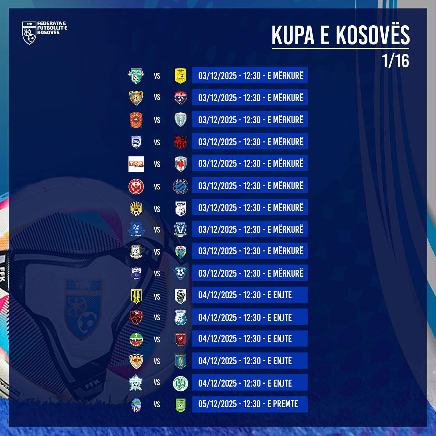 Federata e Futbollit të Kosovës ka hedhur sot shortin për raundin e 1/16 së finales në Kupën e Kosovës, duke zbuluar çiftet që do të përballen në garën e këtij sezoni.