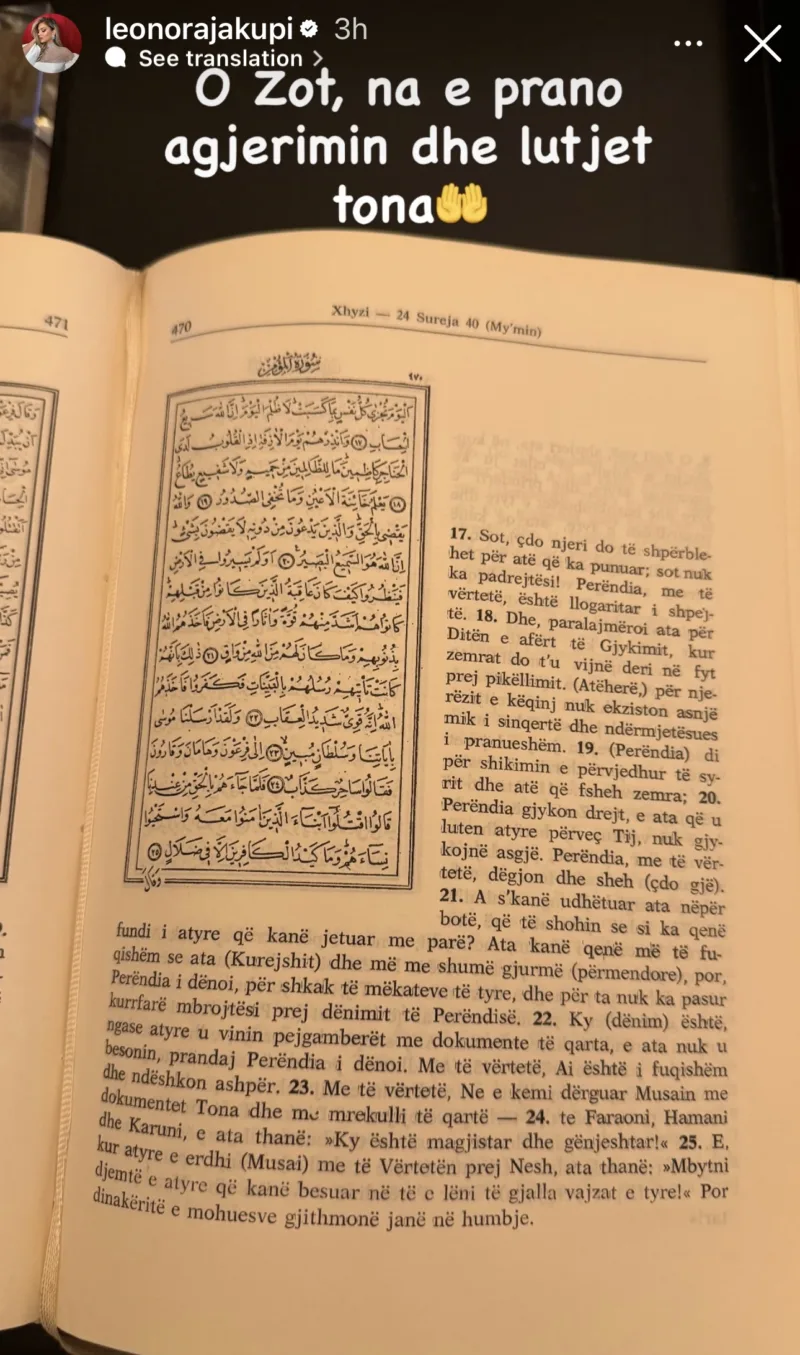 Në imazhin e publikuar shihet libri i shenjtë islam, Kurani, ndërsa Leonora ka bërë me dije se gjatë këtij muaji të shenjtë po i kushton kohë lutjes dhe reflektimit shpirtëror