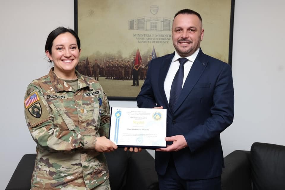“Me këtë rast, për kontributin e dhënë në koordinimin e mbi 150 aktiviteteve të përbashkëta ushtarake, rritjen e bashkëpunimit ushtarak ndërmjet Shteteve të Bashkuara të Amerikës dhe Kosovës, gjë që ka ndikuar dhe në zhvillimin e FSK-së, ministri e dekoroi major Erickson me Medalje për Shërbim të Shquar”, thuhet në njoftim.
