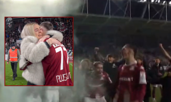 Pas ndeshjes, Krasniqi para tifozëve zbuloi se po pret që të bëhet baba i një djali – teksa video u publikua nga faqja e klubit rumun.
