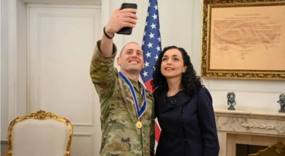 Presidentja e Kosovës, Vjosa Osmani e ka realizuar një selfie me komandantin e Brigadës së 76-të të Këmbësorisë, nënkolonelin Jared B. Sheets.