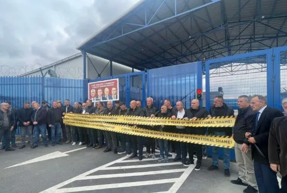 Në një shirit që mbajnë në duar përreth objektit, shkruhet “Pesë vjet padrejtësi e organizuar, 5 vjet turp ndërkombëtar”.