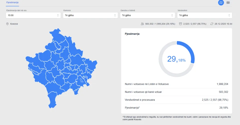 Deri në përditësimin e fundit të orës 16:44, kanë votuar 29.18% e qytetarëve.