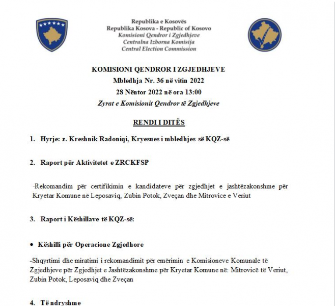 Komisioni Qendror i Zgjedhjeve sot nga ora 13:00 do të mbajë mbledhje, ku pritet të certifikojë kandidatët për kryetar të katër komunave për zgjedhjet e jashtëzakonshme të cilat do të mbahen në Mitrovicë të Veriut, Zveçan, Zubin Potok e Leposaviq.