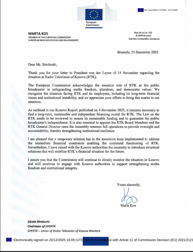 Letra zyrtare e Komisionit Evropian, e dërguar më 23 dhjetor 2025, i është bashkëngjitur këtij njoftimi për informim të publikut dhe mediave.
