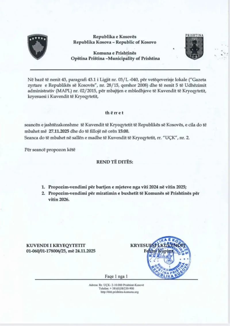 Kryesuesi i Kuvendit Komunal të Prishtinës ka thirrur seancë të jashtëzakonshme për bartjen e mjeteve vetanake të kryeqytetit dhe për buxhetin e vitit 2026.