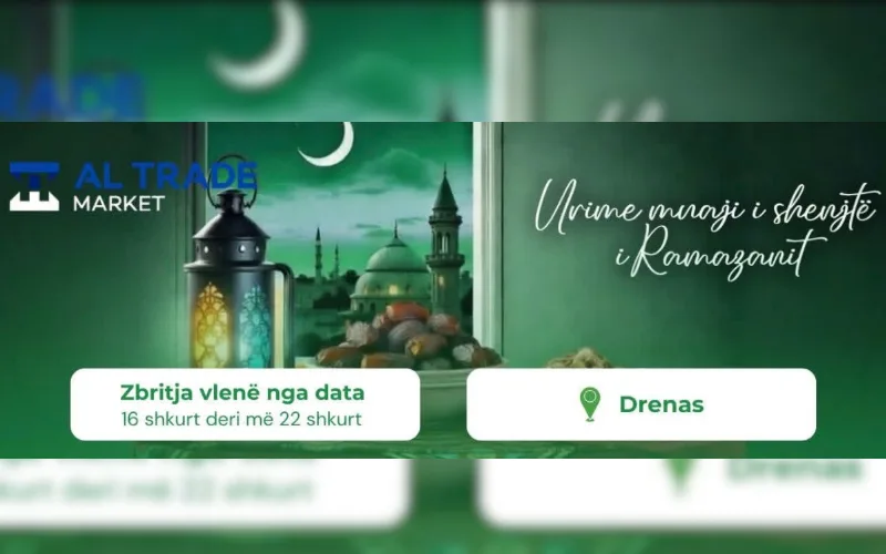 Në prag të muajit të Ramazanit, Al Trade Market ka nisur një ofertë speciale me zbritje në produkte të ndryshme për konsumatorët në Drenas. Oferta do të zgjasë nga 16 deri më 22 shkurt 2026, duke u ofruar qytetarëve mundësi kursimi në blerjet e përditshme.